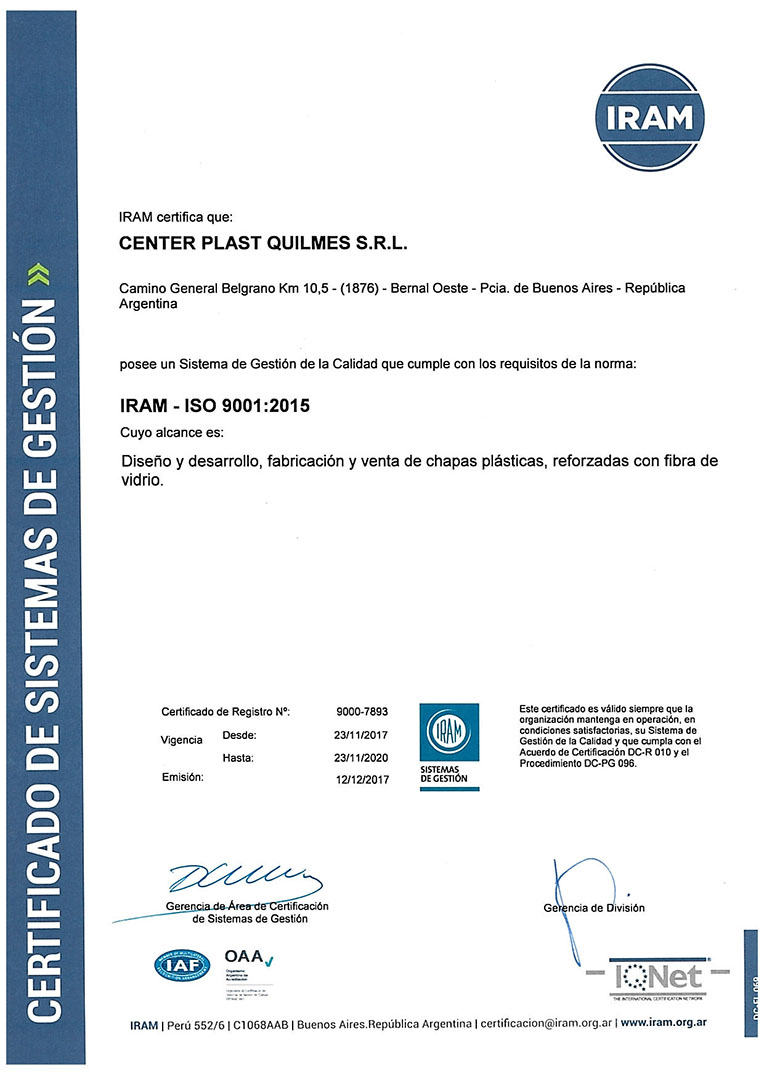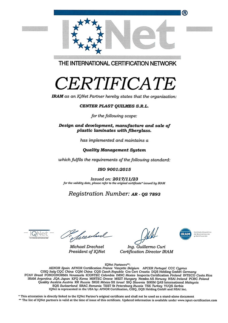 We are a leading company with over 40 years of experience, certified by IRAM ISO 9001:2015 - Quality Management in the manufacture of glass fiber reinforced laminated plastics (GFRP).